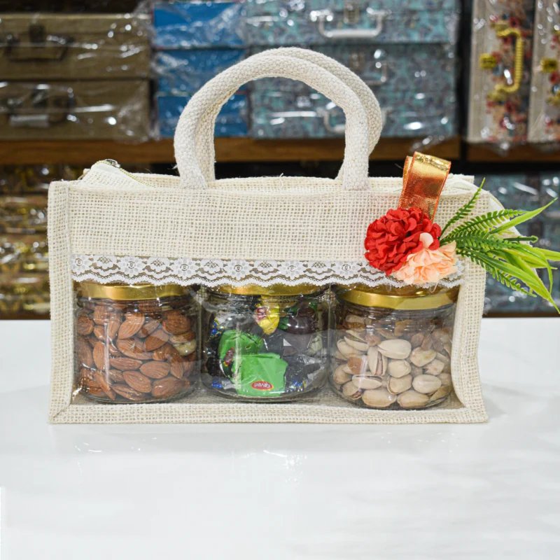Premium 3-Jar Dry Fruit & Chocolate Gift Hamper – Reusable Jute Bag (200g Each Jar)