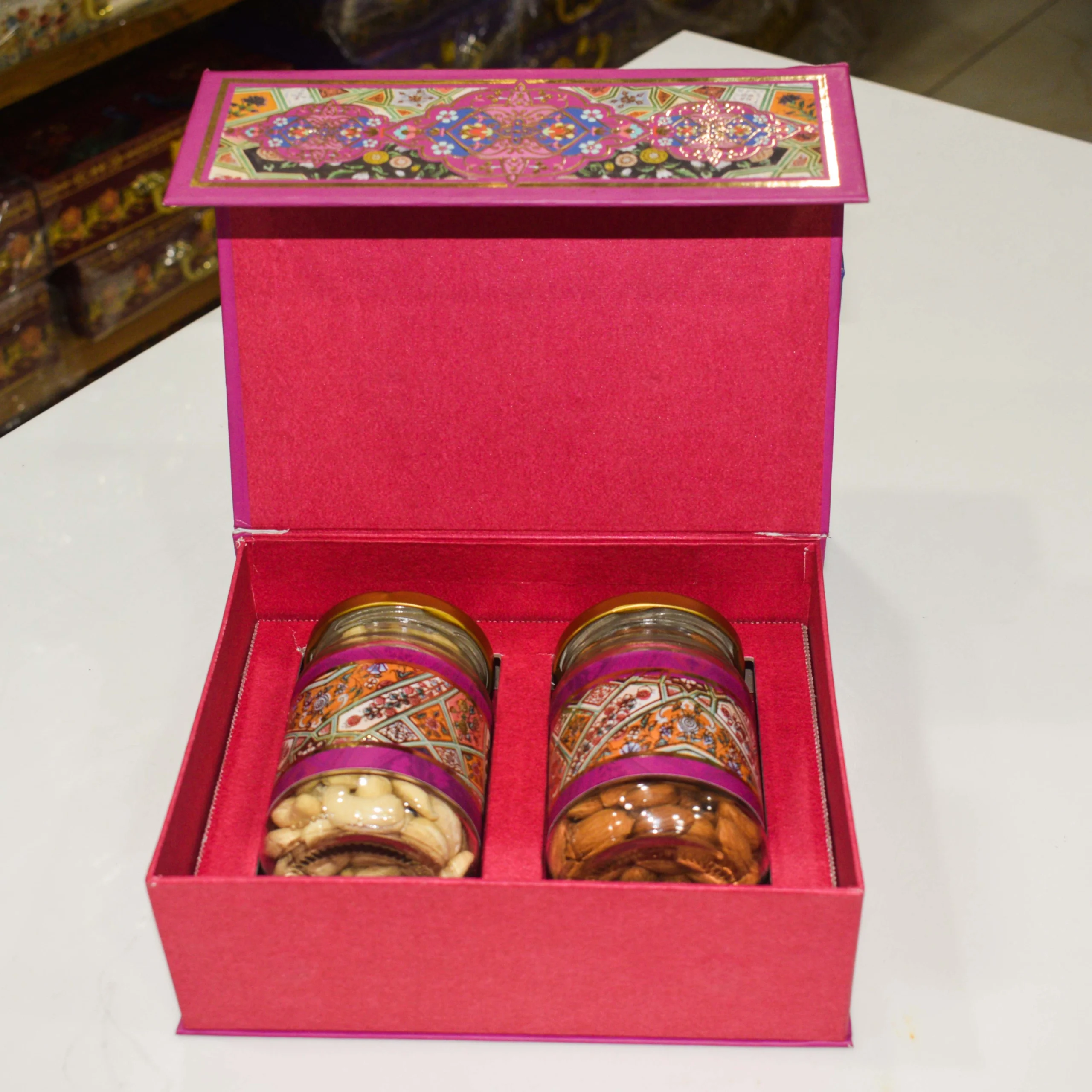 Elevate your gifting with our Luxury Two-Jar (150g each) Dry Fruit & Chocolate Gift Hamper. Housed in a striking kapa-inspired box with rich patterns and a regal color palette, this compact two-jar set combines a curated selection of premium dry fruits, roasted and flavored nuts, and decadent chocolates. Each jar is airtight to preserve freshness, while a luxe satin-lined insert keeps contents securely displayed. The ornate exterior and keepsake-ready interior make this hamper ideal for weddings, festive celebrations, corporate gifting, anniversaries, and any moment that calls for refined taste and generosity.