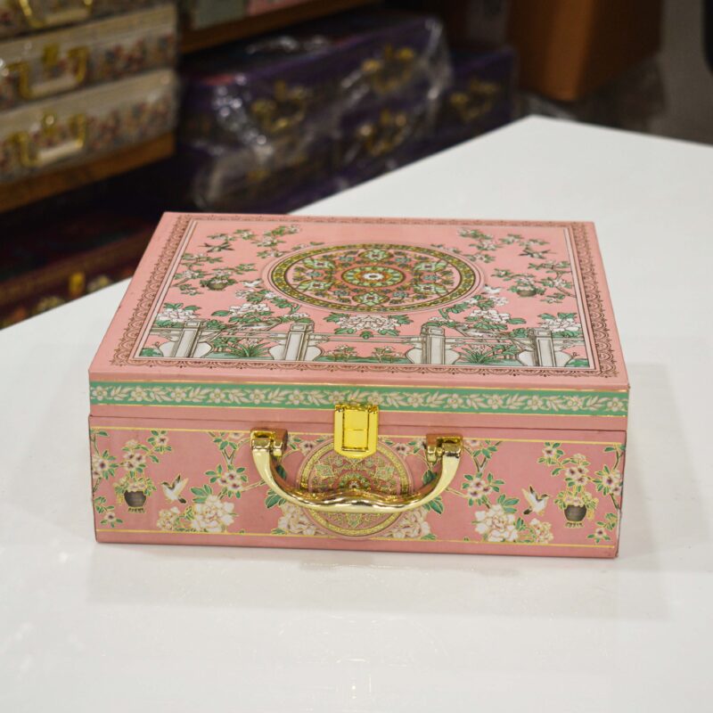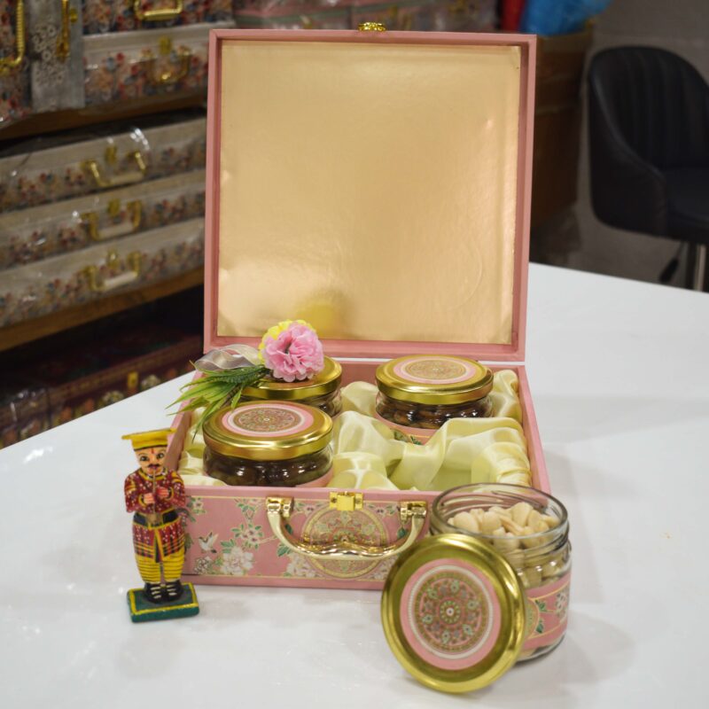 A charming pink floral gift box with golden detailing, designed with 4 elegant glass jars. The satin base inside gives it a luxurious touch, while the decorative handle adds style and convenience. Perfect for festive gifting, weddings, and special occasions.