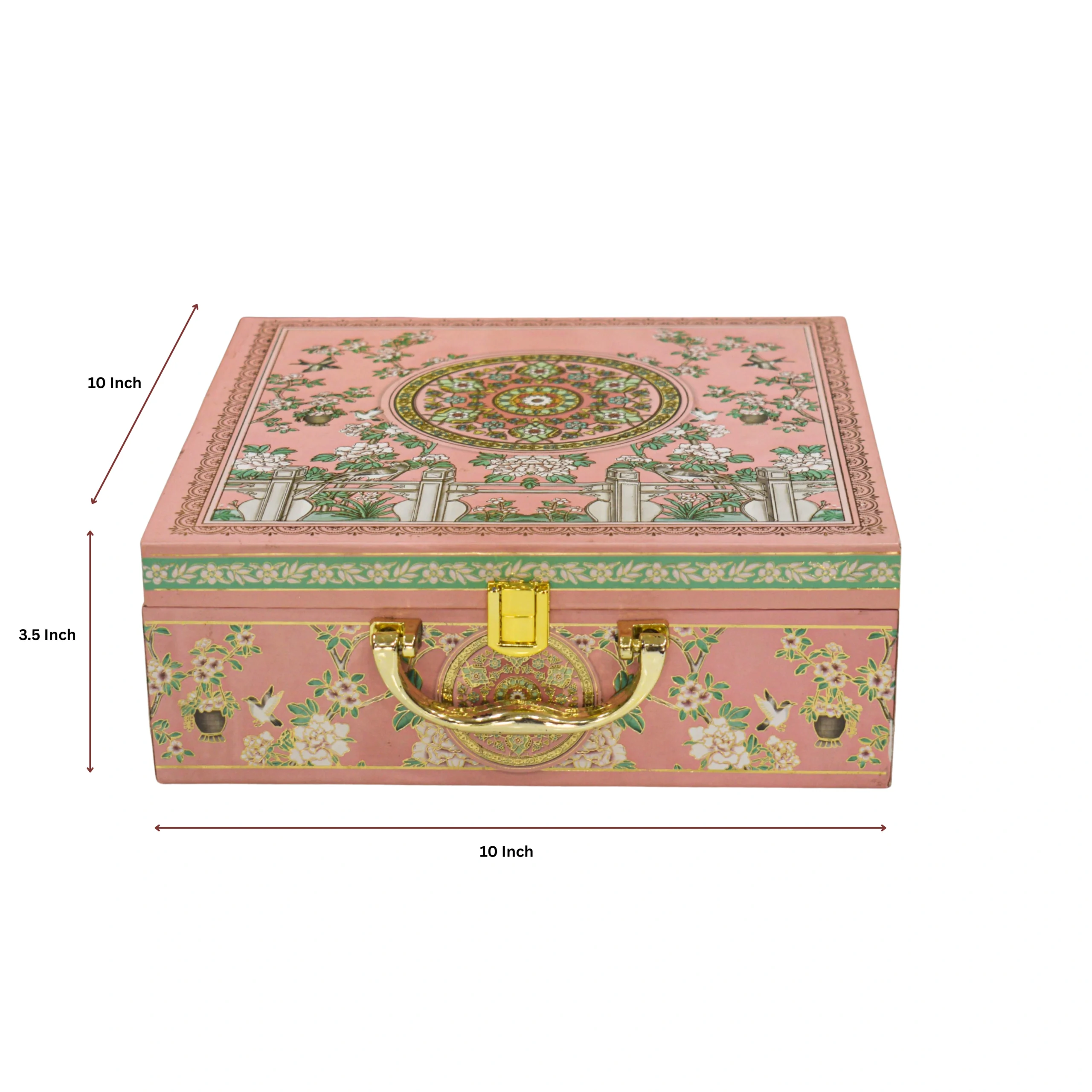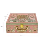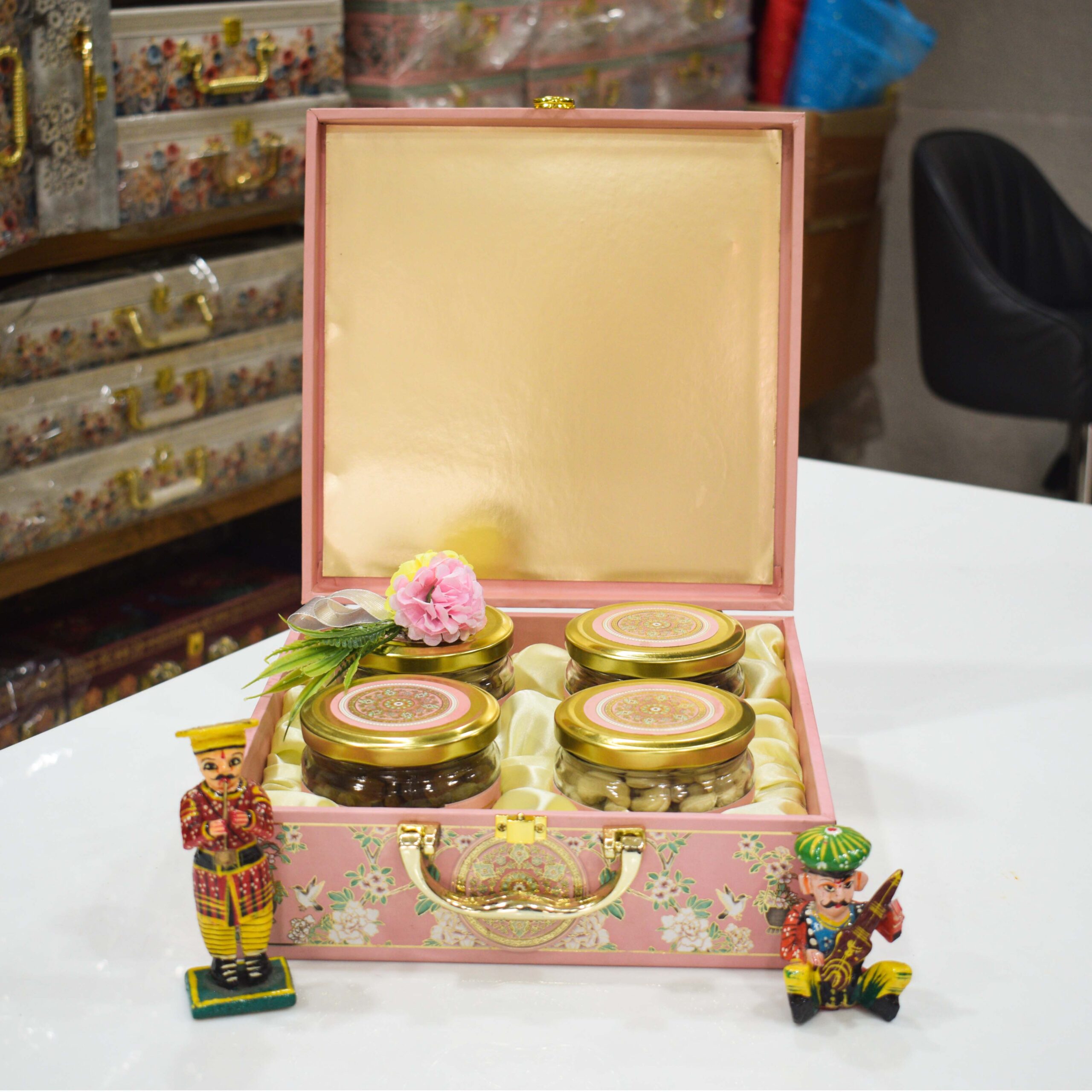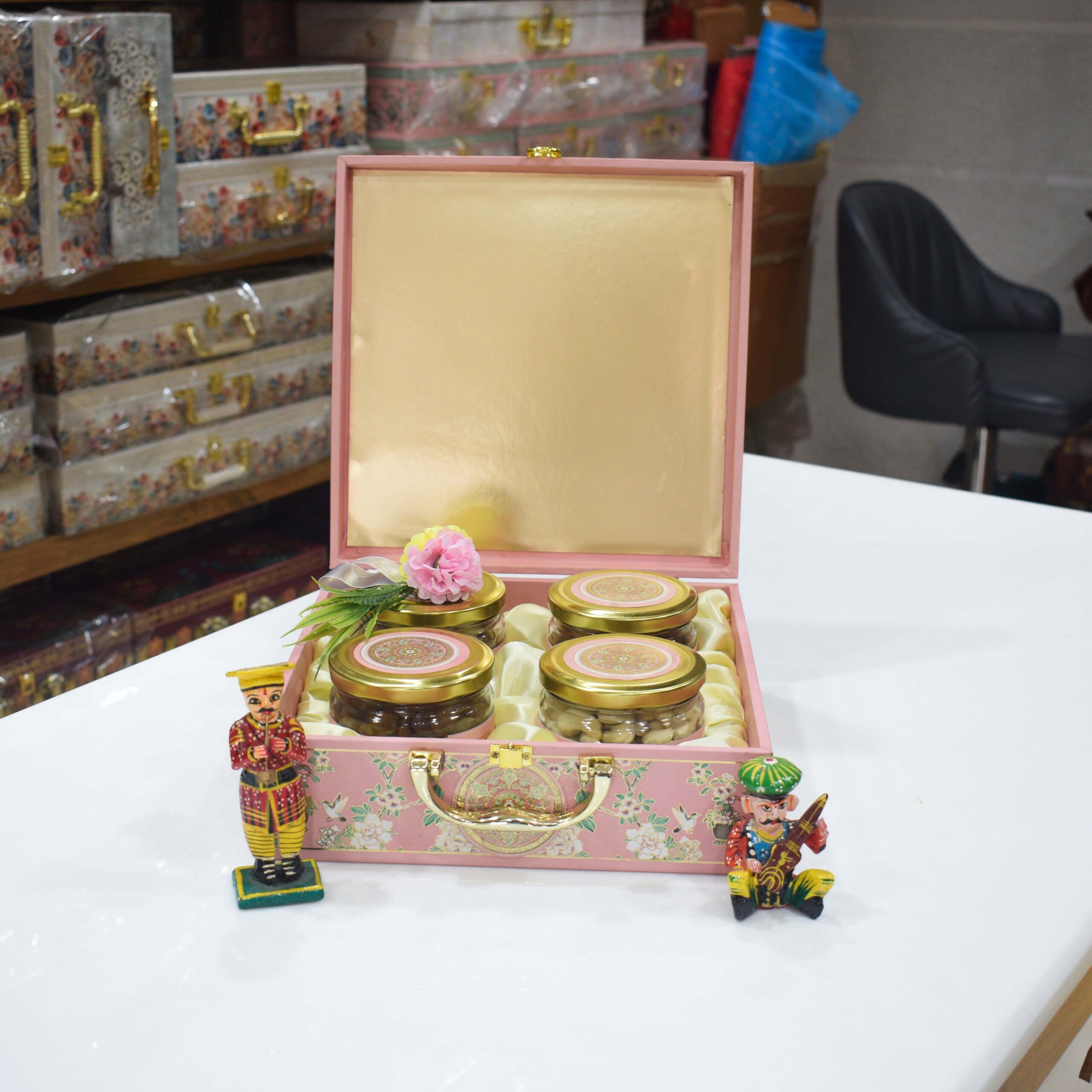 A charming pink floral gift box with golden detailing, designed with 4 elegant glass jars. The satin base inside gives it a luxurious touch, while the decorative handle adds style and convenience. Perfect for festive gifting, weddings, and special occasions.
